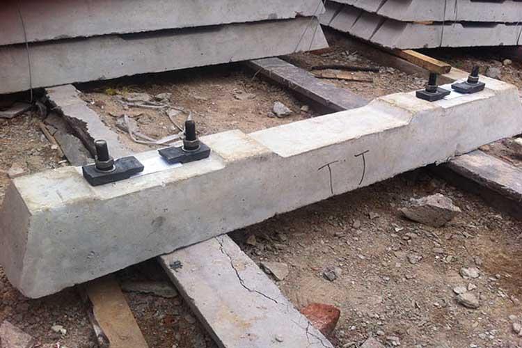 栓壓板型的水泥枕木是用T型螺栓從軌枕下面預(yù)留孔中穿出上面固定住壓板壓住鋼軌,一根軌枕需要4套螺栓,4個壓板,2個橡膠墊板,這種軌枕養(yǎng)護方便,可以重復(fù)利用。