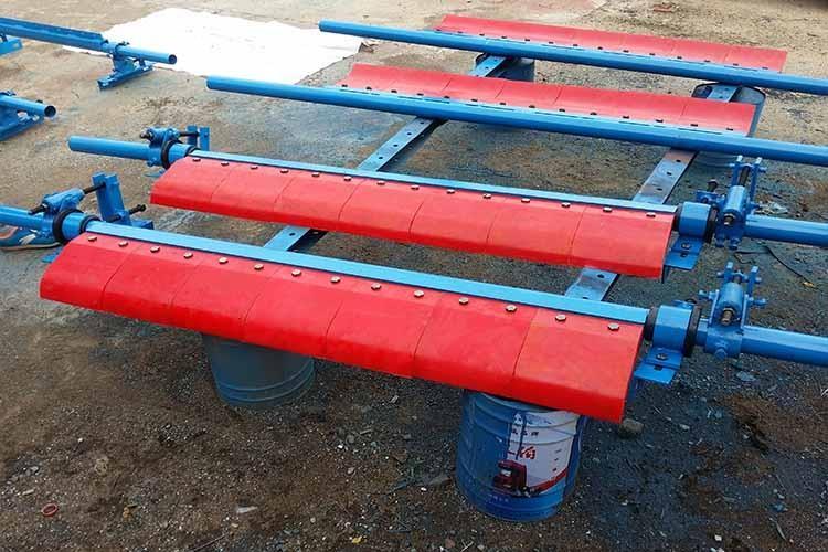 刮刀采用聚氯脂復(fù)合材料,利用模具一體加硫成形,刮刀面平整,直線度好,低摩擦、高耐磨、高強(qiáng)度,具有穩(wěn)定的刮料效果??捎行宄龤埩羝现?xì)粒、濕粘物料。預(yù)壓式調(diào)壓器確保刮刀與皮帶的穩(wěn)定接觸壓力。刮刀面由多塊窄幅聚氨脂刮板組成,具有空形緩沖孔,對(duì)各種皮帶都有良好跟隨性。